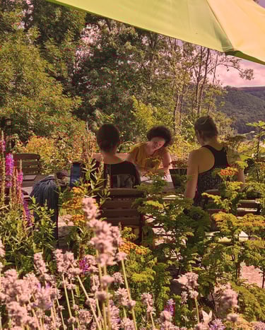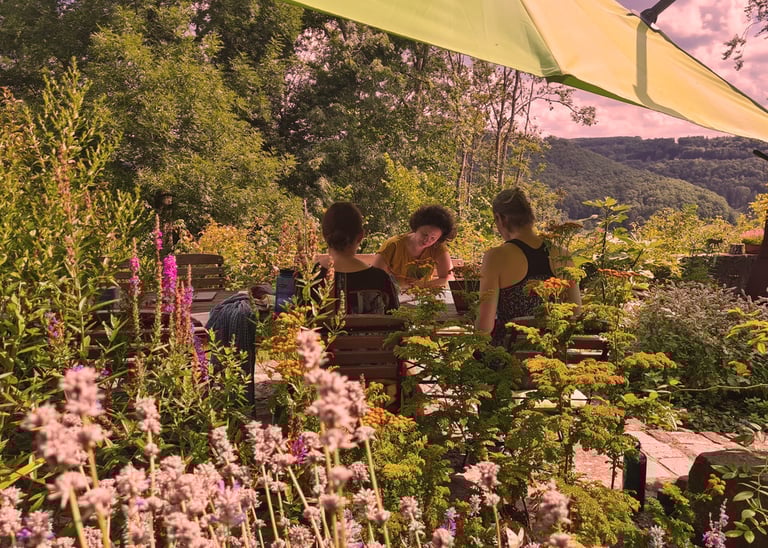 Lass dich inspirieren von der Aussicht, den Blumen, dem Vogelzwitschern und bekomme leuchtende Augen, weil du tief eintauchst in deinen Schreibflow.